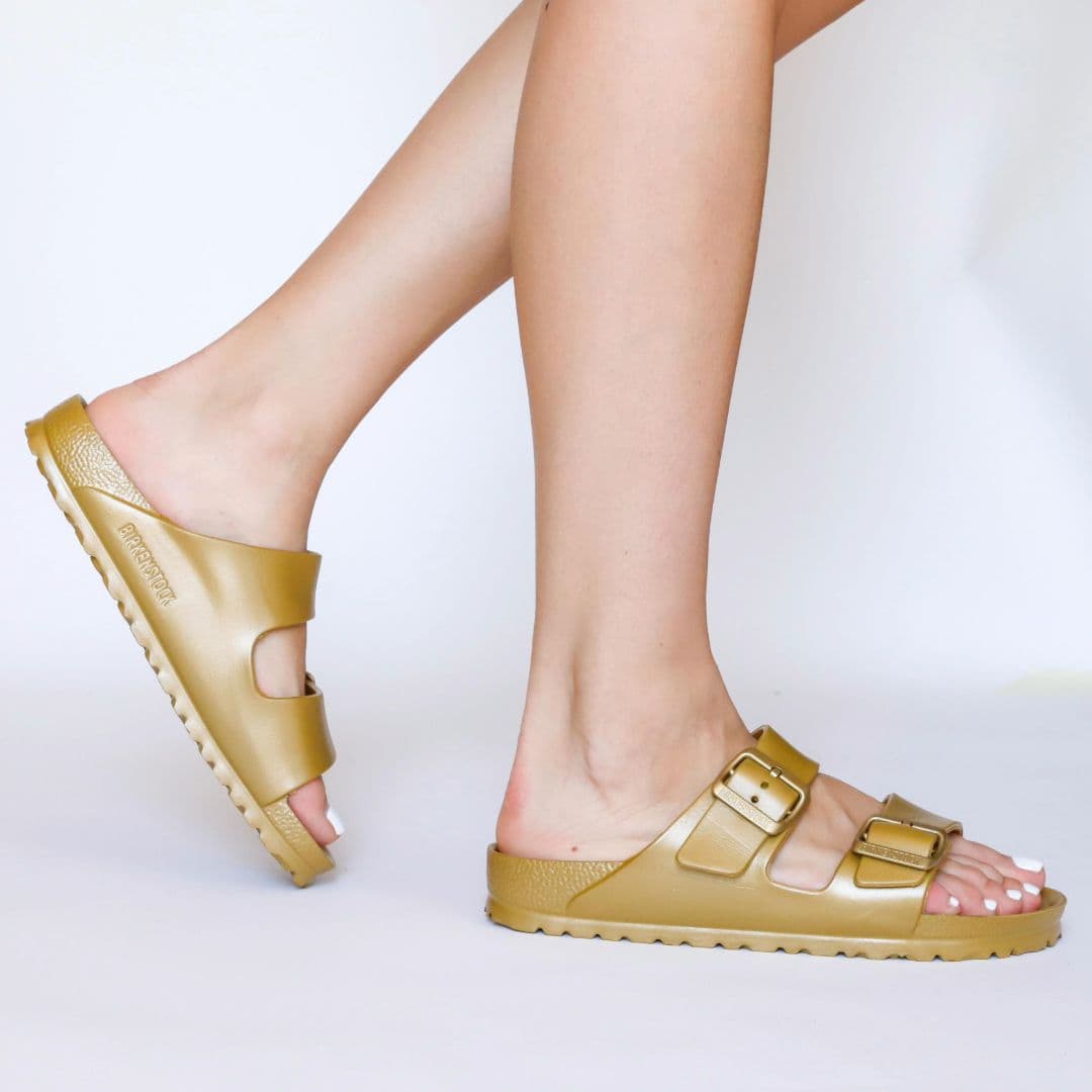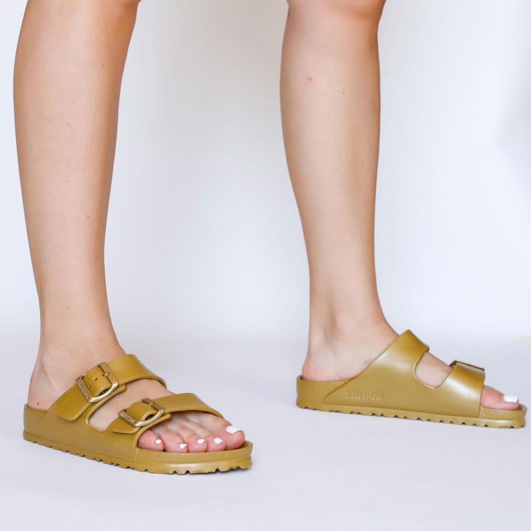Le Birkenstock Arizona Eva sono l’evoluzione di un vero classico del brand tedesco leader mondiale, che conquista uomini e donne da sempre. Il materiale plastico EVA è di alta qualità, non ha odore o sostanze inquinanti, è molto leggero, altamente elastico, impermeabile e dermoaffine. La tomaia color oro è regolabile individualmente con due cinturini ed il plantare anatomico le rendono una scarpa cult dal confort unico.