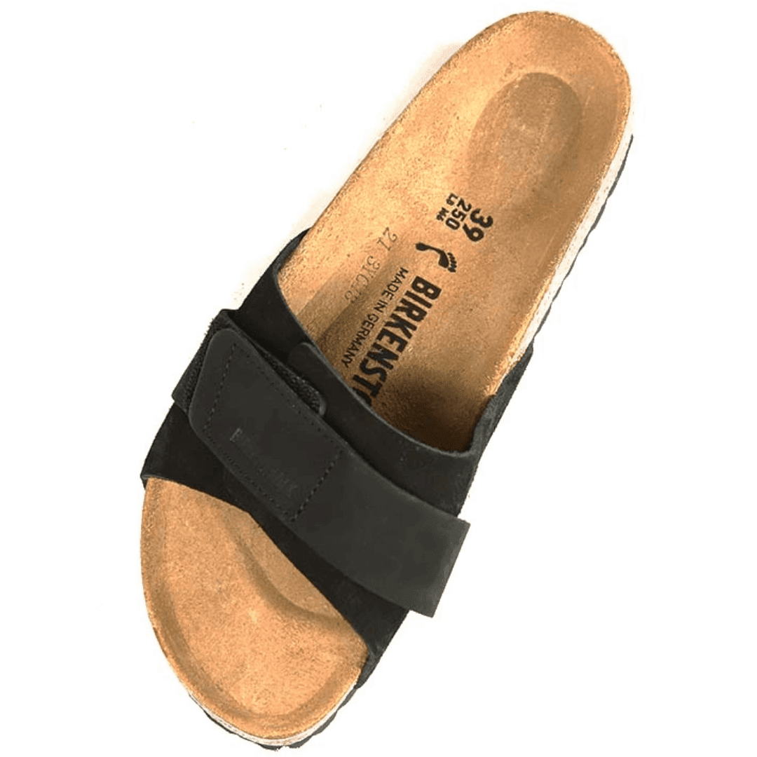 Le Birkenstck Oita sono ispirate al classico Kyoto e sono caratterizzate da un design slanciato e femminile. La fascia è regolabile utilizzando la chiusura con il velcro. che garantisce una stabilità ottimale. Sono realizzate in pelle scamosciata nera particolarmente morbida, che aderisce al piede, in combinazione a pregiata pelle nabuk.