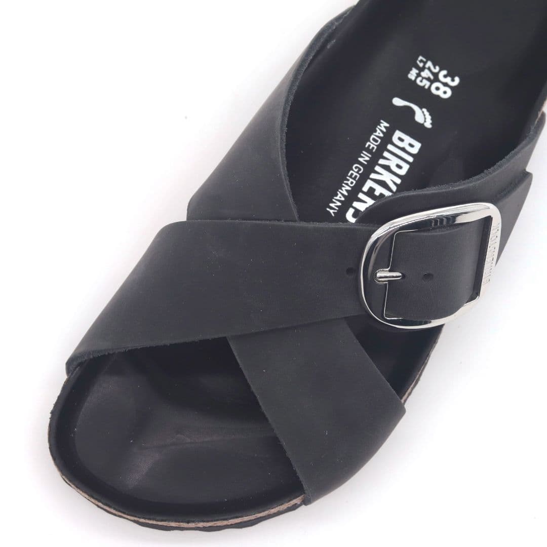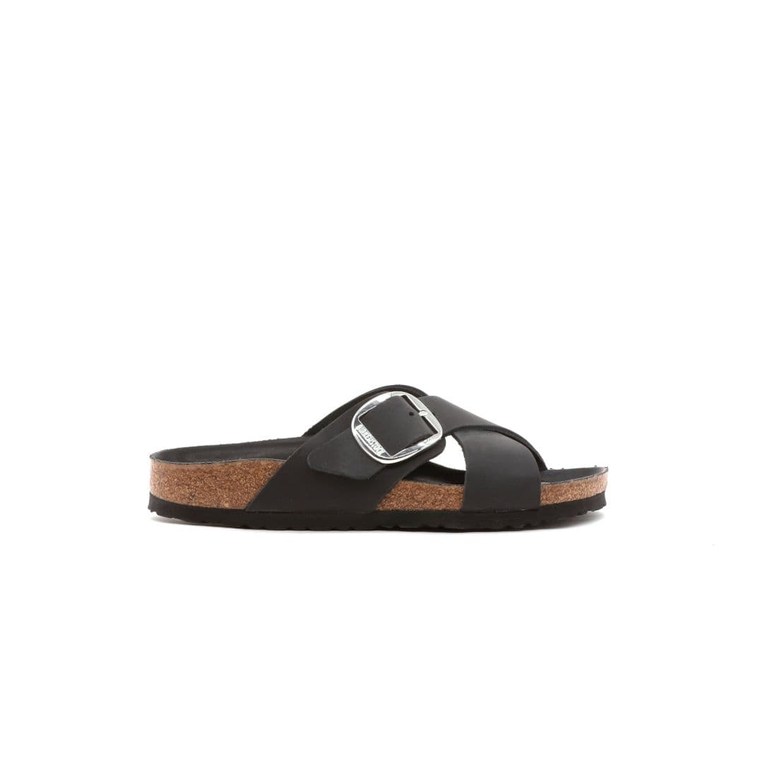 Le Birkenstock Siena Big Buckle sono caratterizzato da un look elegante, caratterizzate dai cinturini incrociati che conferiscono al sandalo il suo look tutto unico. La versione Big Buckle presenta una fibbia ad ardiglione grande ed elegante, e il sottopiede del plantare semi-exquisit è rivestito in morbida pelle liscia in colore coordinato alla scarpa. La tomaia è composta da pelle nera particolarmente spessa e oliata, lavorata a cuciture aperte.