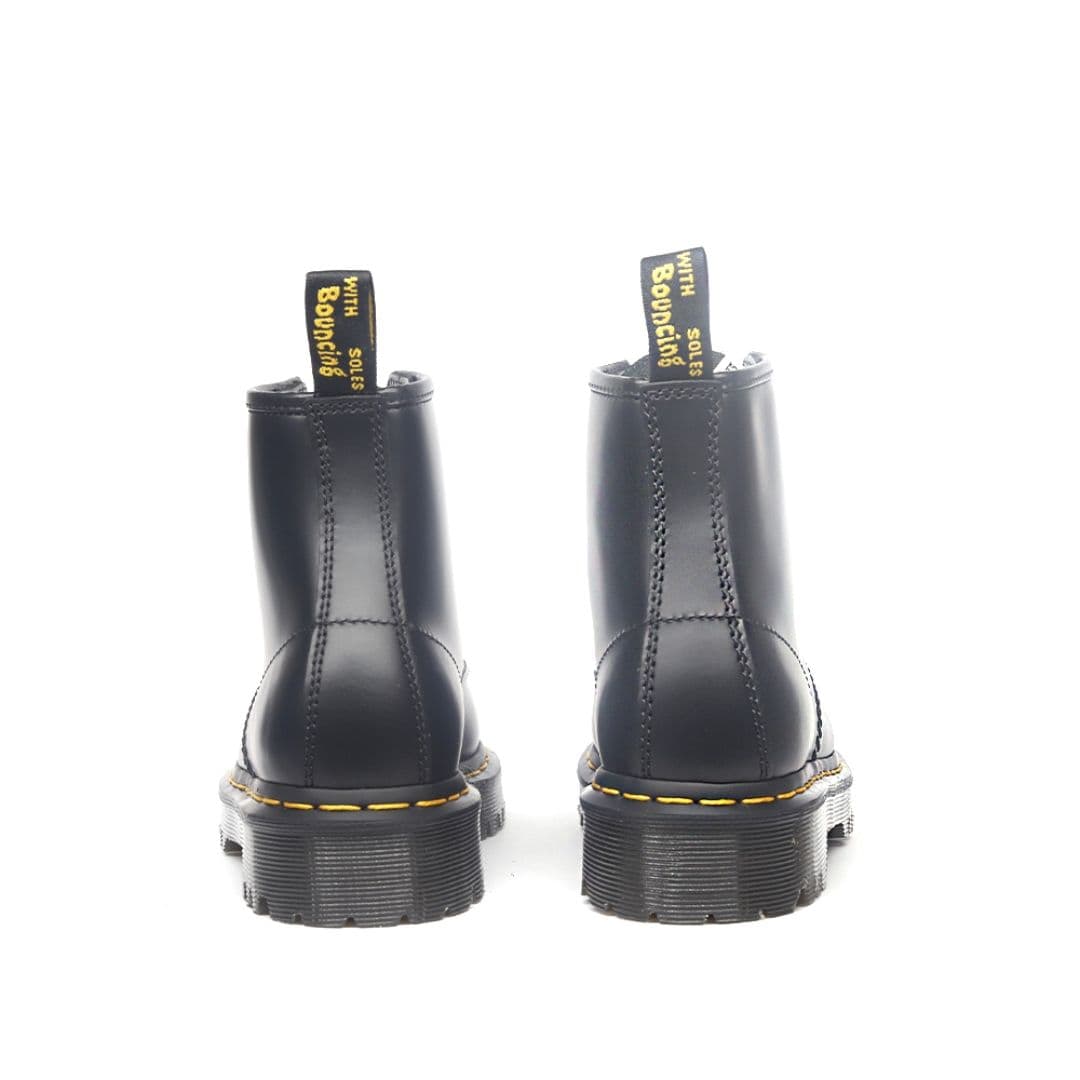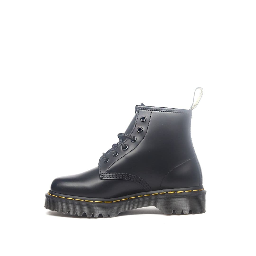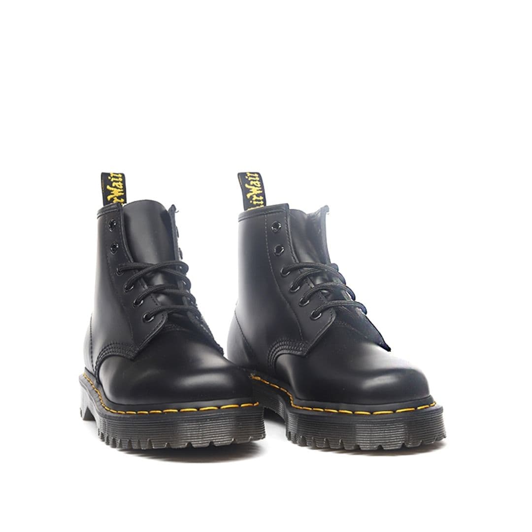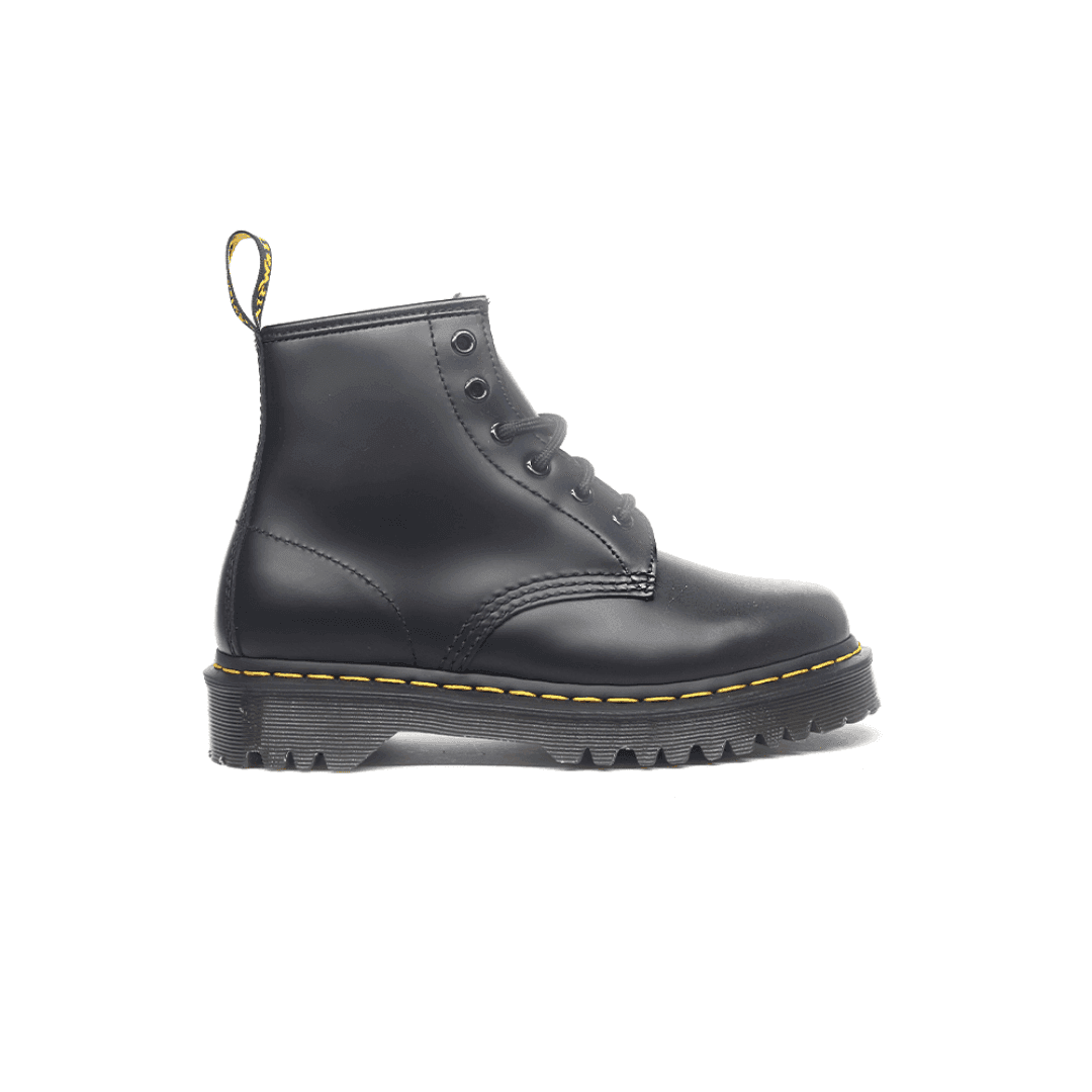 Le Dr. Martens 101 Bex sono la nuova versione che arriva poco sopra la caviglia, mantenendo comunque tutte le caratteristiche uniche dei più conosciuti Docs 1460. Sono realizzate in pelle nera con 6 fori. Questa versione è montata sulla nuova suola Bex, caratterizzata un lieve carro armato, e dotata dell’iconica cucitura lungo la suola gialla, oltre all’inconfondibile fettuccia con marchio AirWair sul tallone.