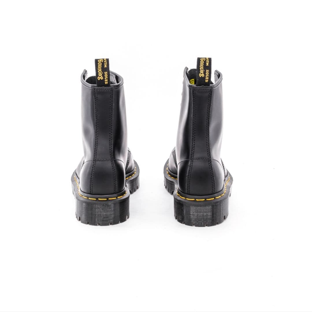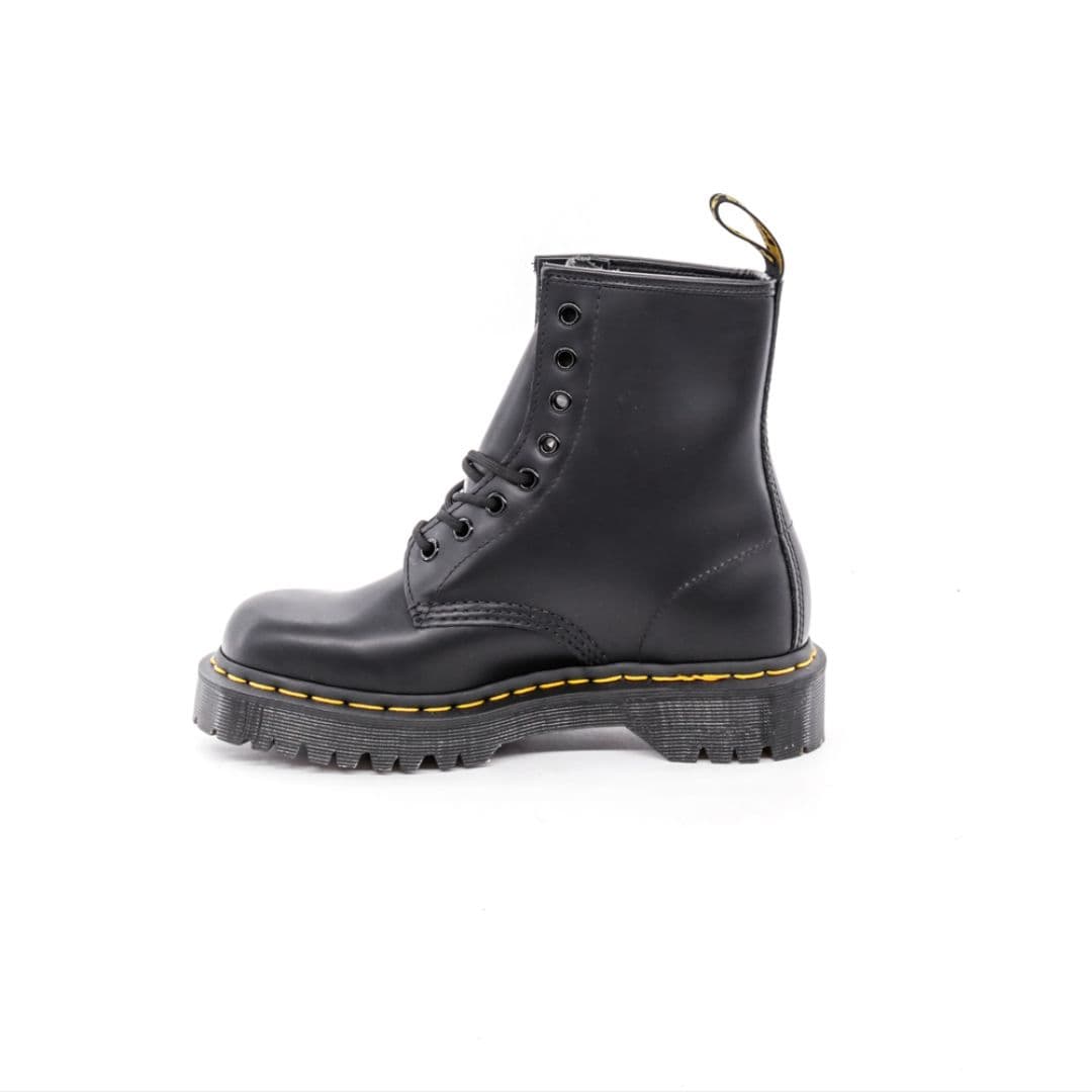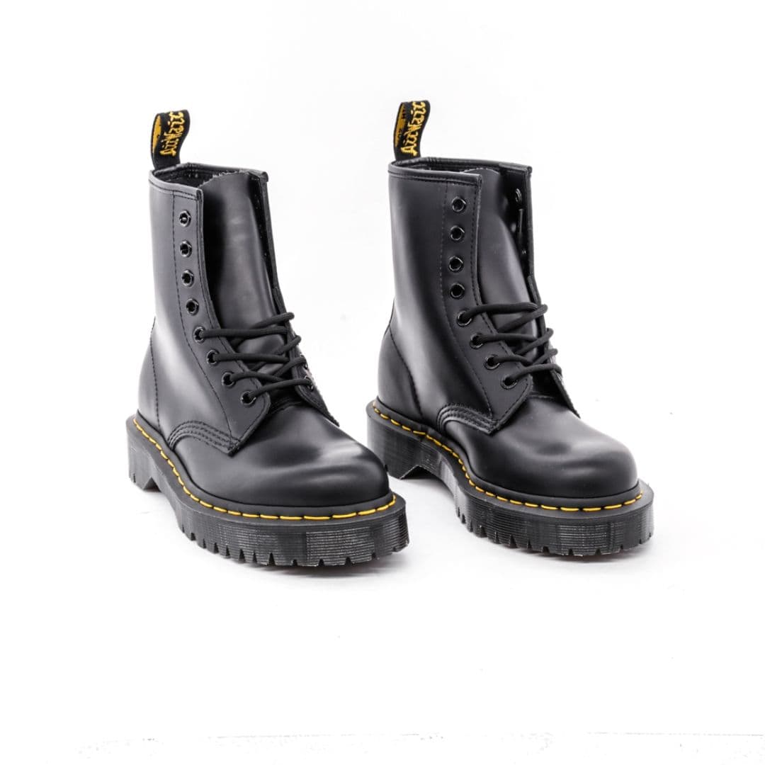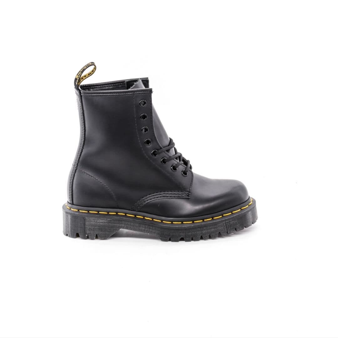 Le Dr. Martens 1460 sono sicuramente gli anfibi più famosi del brand inglese, un vero e proprio mito streetwear con uno stile unico che non conosce tempo. Sono realizzate in pelle nera con 8 fori. Questa versione è montata sulla nuova suola Bex, caratterizzata da un leggero carro armato, e dotata dell’iconica cucitura lungo la suola gialla, oltre all’inconfondibile fettuccia con marchio AirWair sul tallone.