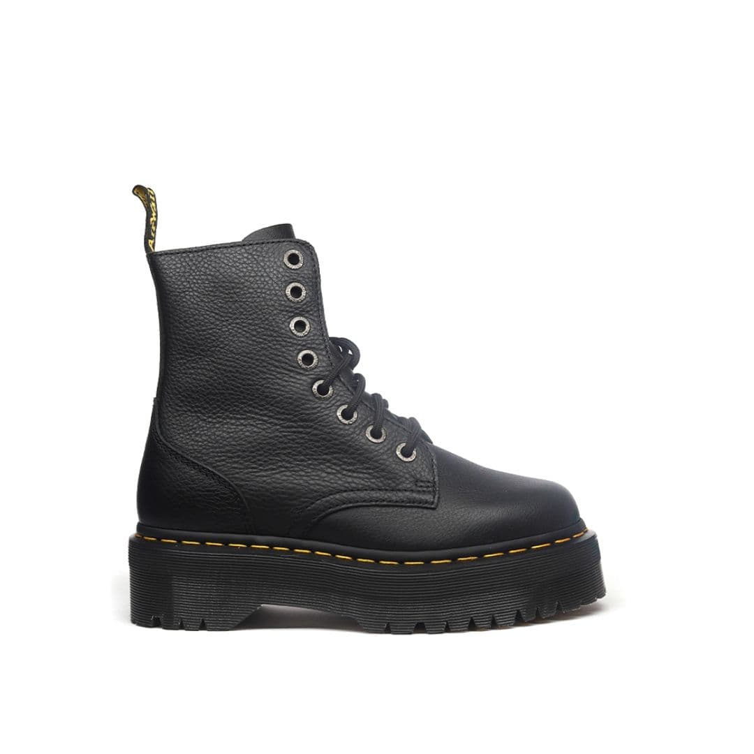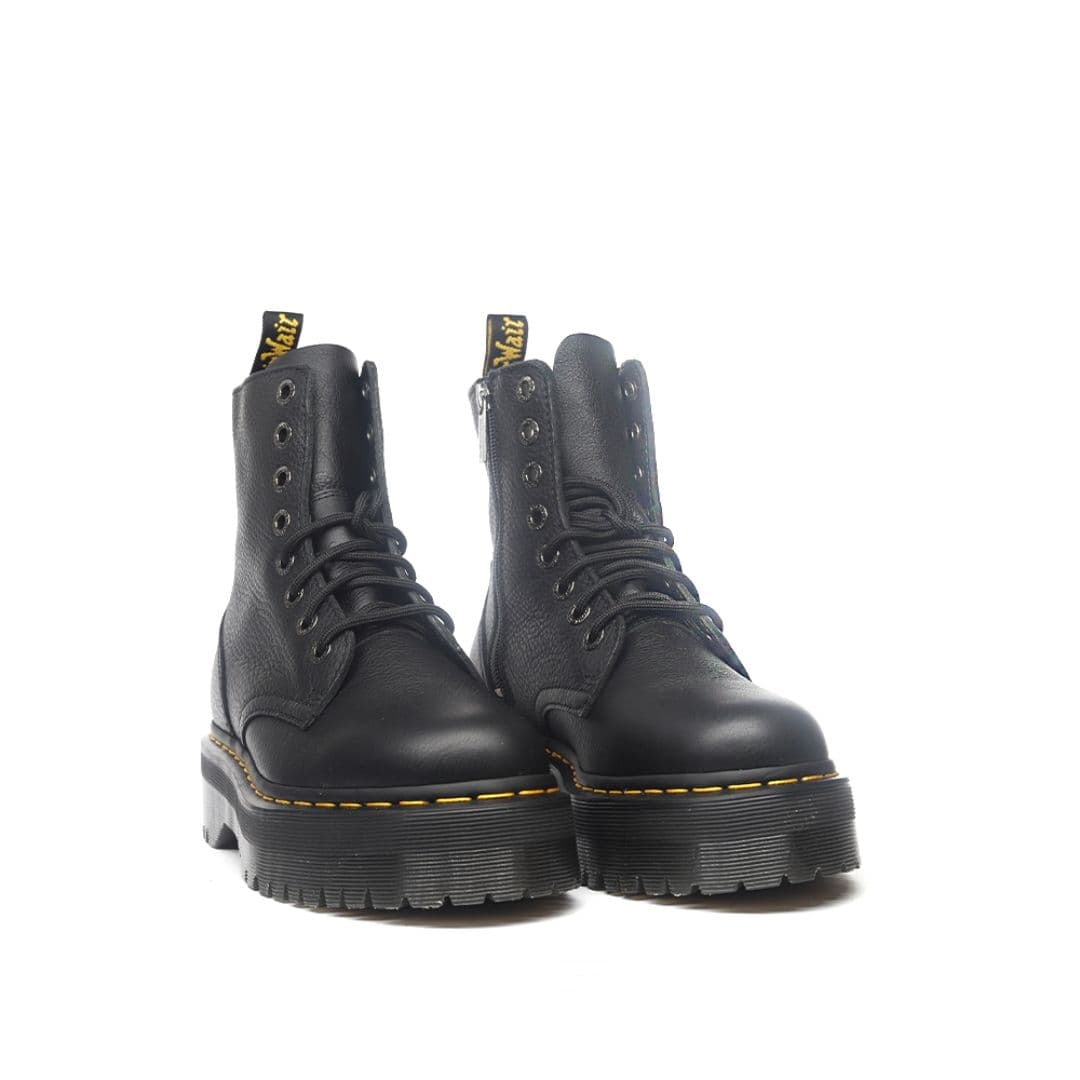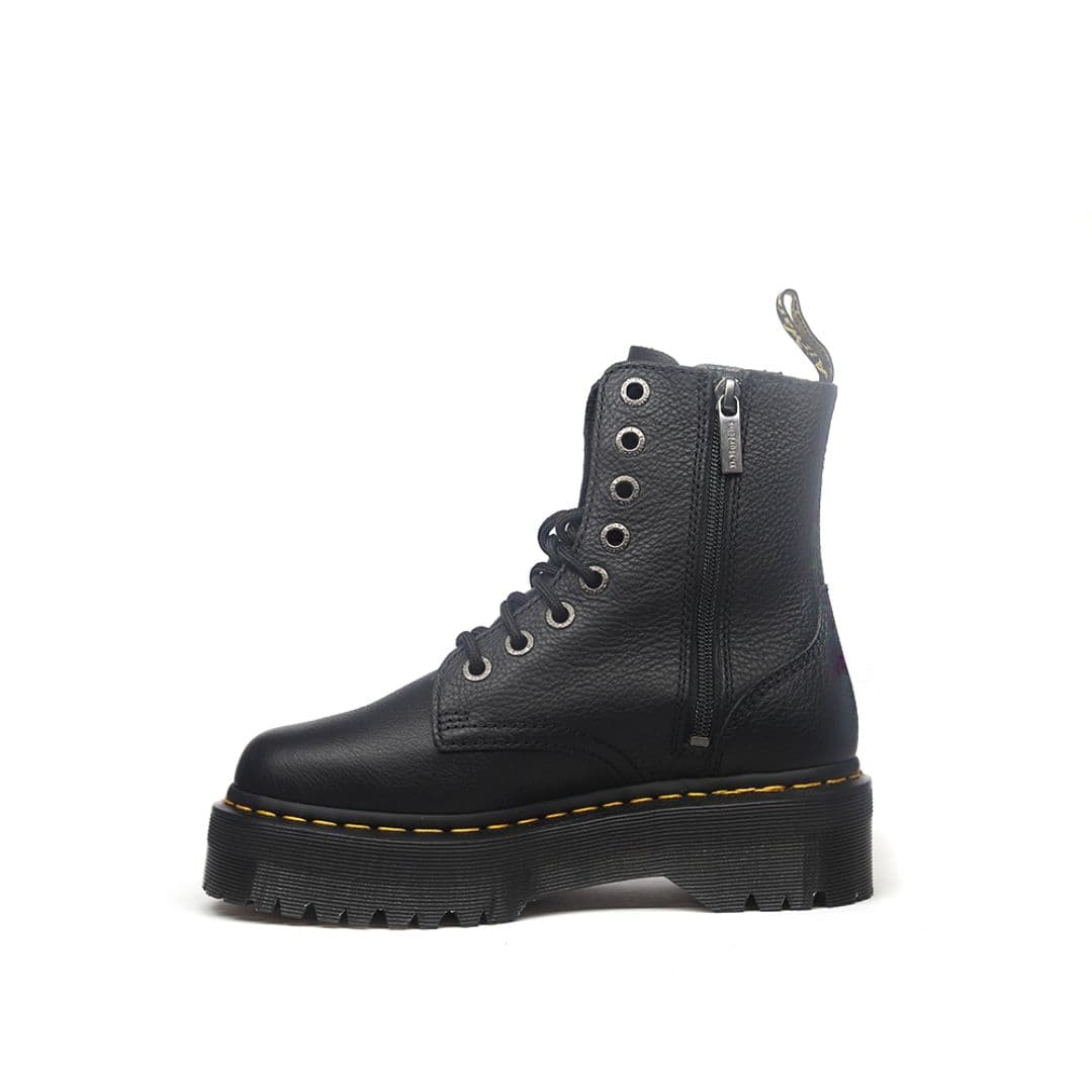 Le Dr. Martens Jadon III sono la rivisitazione in chiave underground dei più conosciuti Docs 1460. Sono realizzate in pelle morbida nera con 8 fori e la cucitura gialla lungo la suola, oltre all’inconfondibile fettuccia con marchio AirWair sul tallone. Si differenziano per il platform con cuscinetto d’aria e la cerniera interna che si sostituisce nell’utilizzo ai lacci.