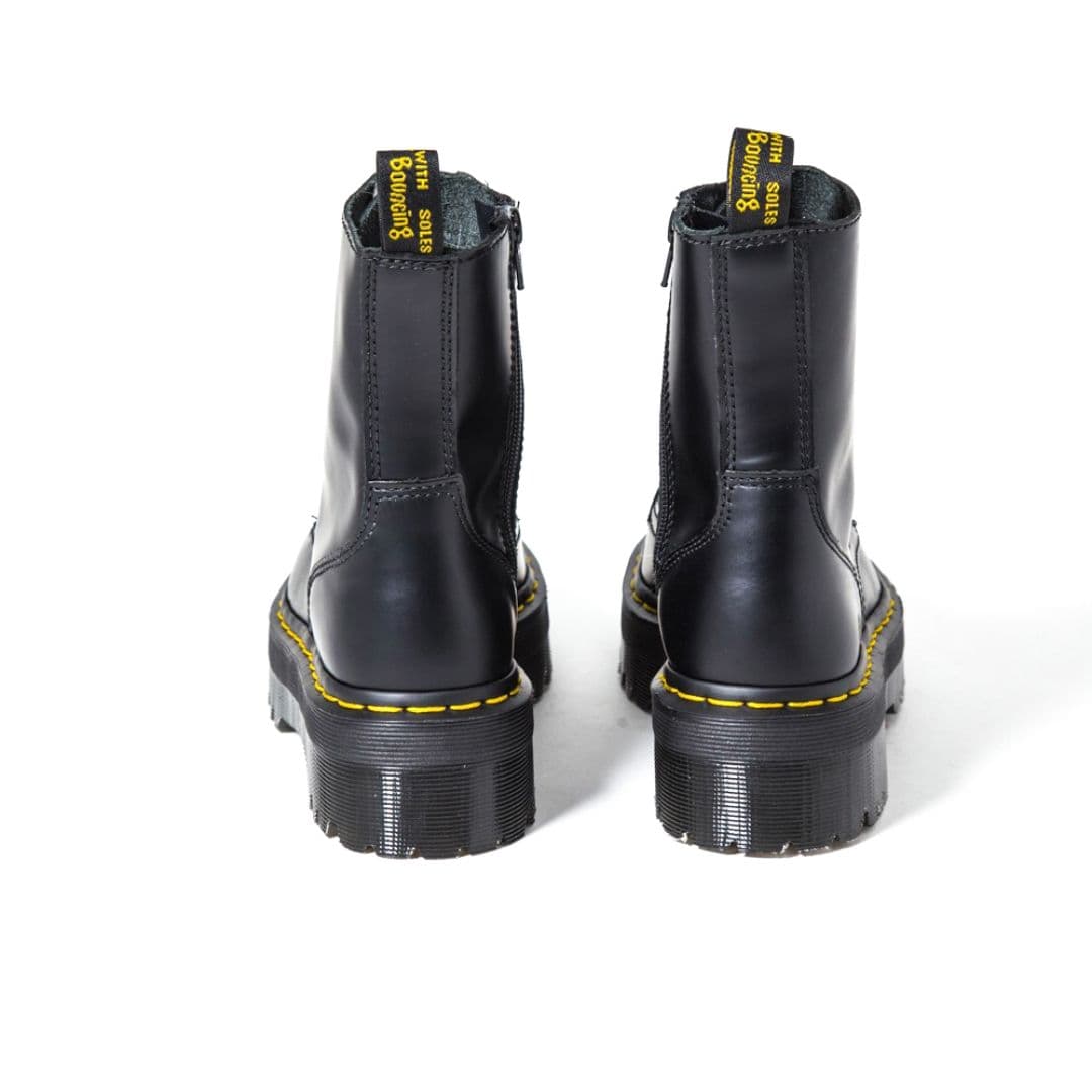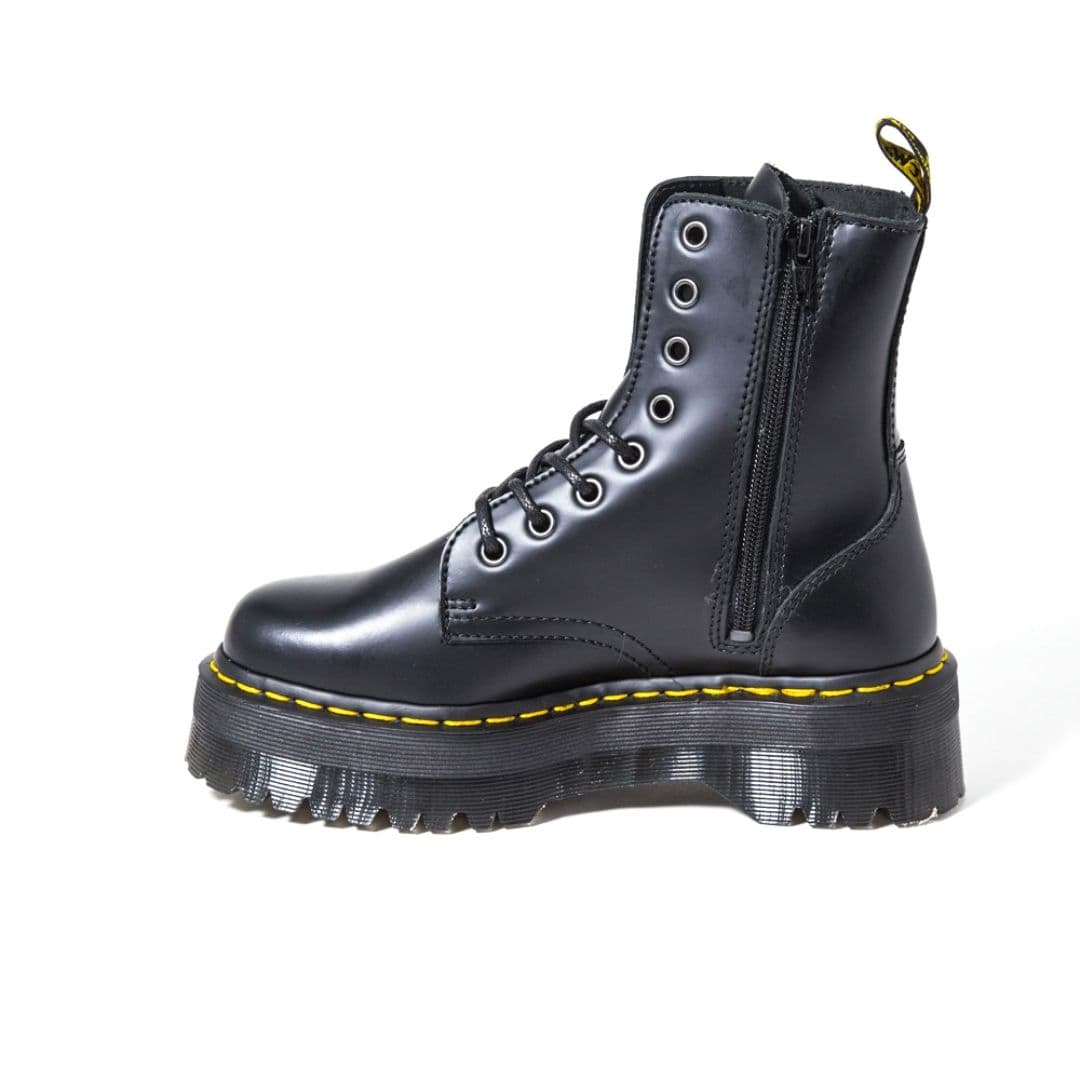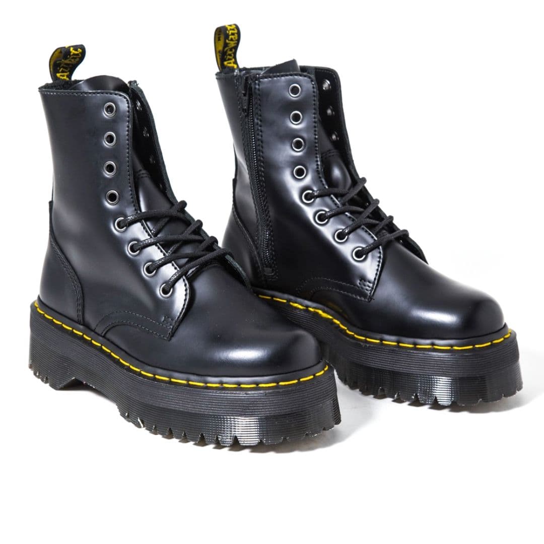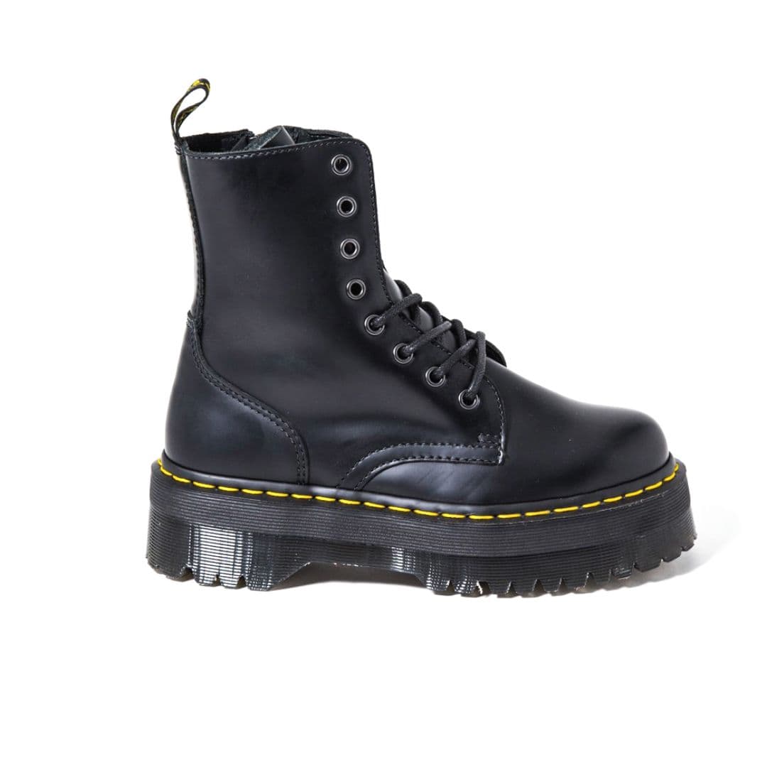 Le Dr. Martens Jadon sono la rivisitazione in chiave underground dei più conosciuti Docs 1460. Sono realizzate in pelle nera con 8 fori e la cucitura gialla lungo la suola, oltre all’inconfondibile fettuccia con marchio AirWair sul tallone. Si differenziano per il platform con cuscinetto d’aria e la cerniera interna che si sostituisce nell’utilizzo ai lacci.