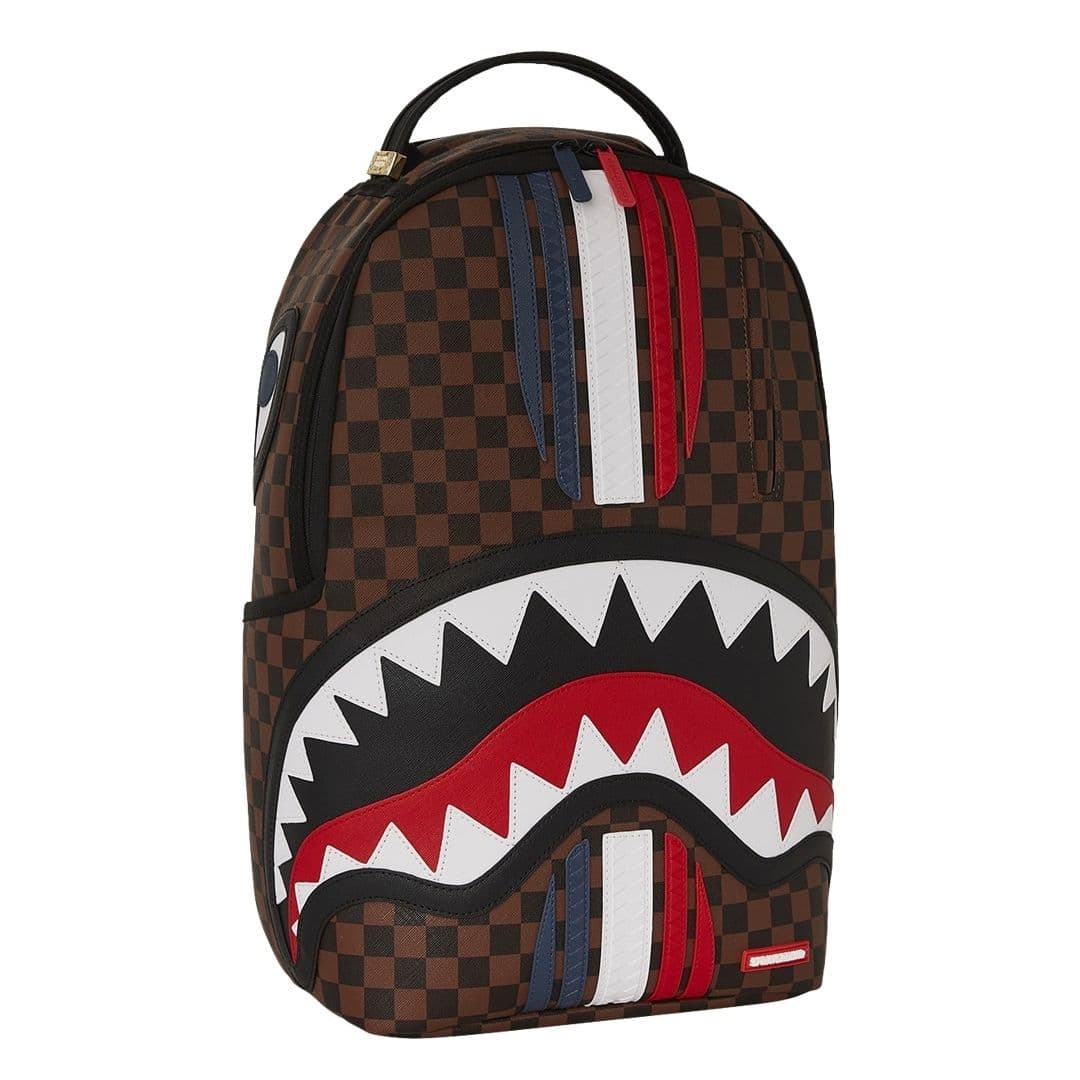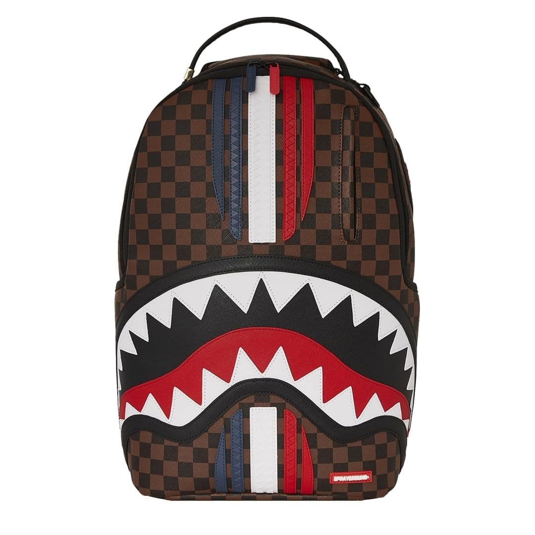 Lo zaino Sprayground presenta il suo iconico motivo con i denti di squalo su ecopelle checkerboard nero e marrone con stripes che formano la bandiera francese, impermeabile. Lo scomparto principale presenta uno tasca per laptop separato, mentre la parte posteriore nasconde un’imbottitura ergonomica in rete. Le cerniere e le cinghie regolabili permettono il massimo del confort. Nota: le misure dell’articolo sono 45,7 x 15,2 x 29,2 cm.